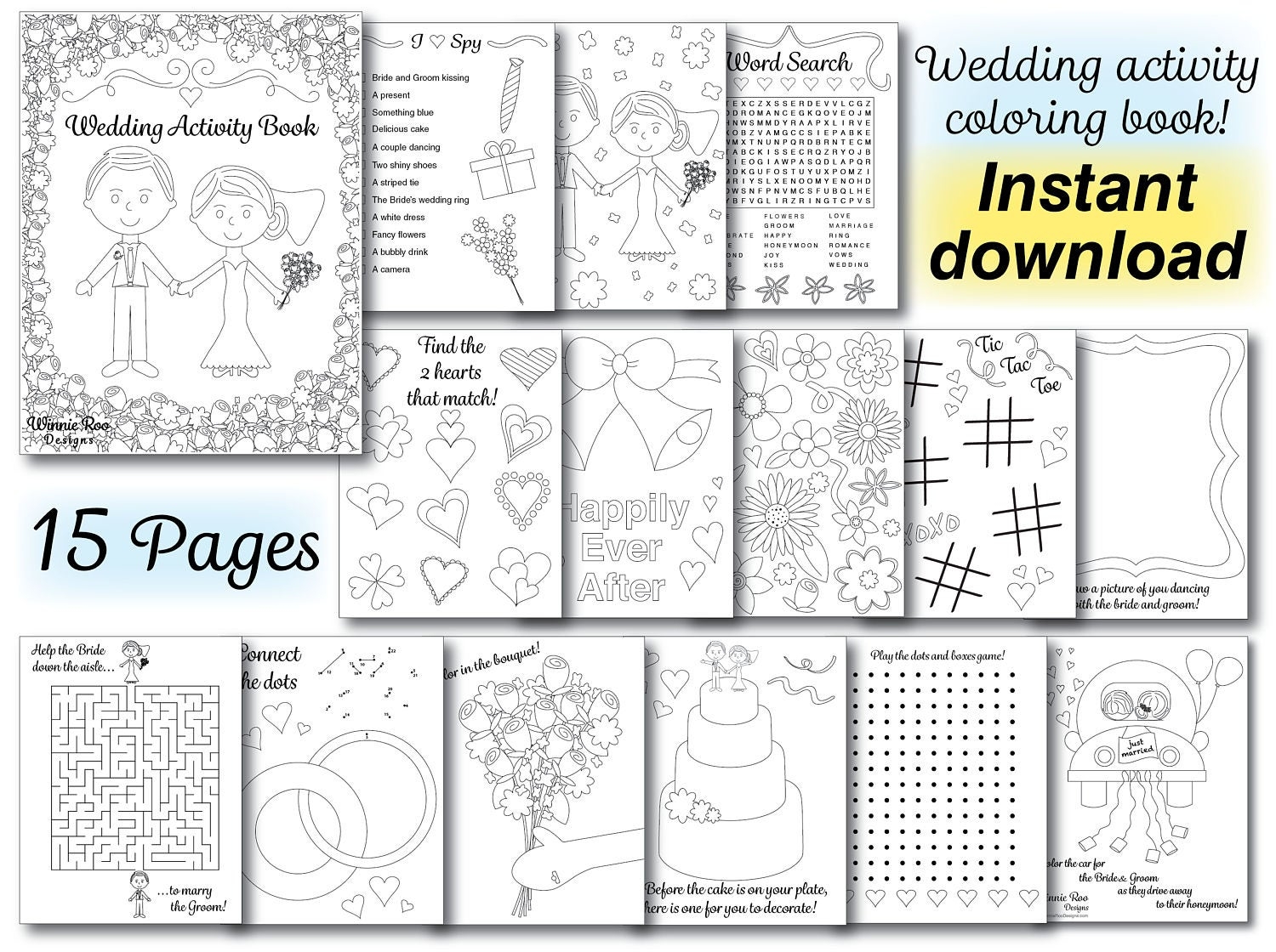 Weddings are memorable events not just for the bride and groom, but also for the guests attending, including the little ones. Keeping children entertained during a wedding reception can be a challenge, which is why having a coloring activity book can be a great idea. These free printable wedding activity book pages are perfect for keeping kids busy and engaged during the festivities.