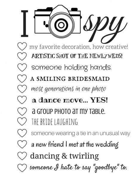 Make sure to download and print out your own free printable “I Spy” game for your wedding day to ensure that your guests have a blast capturing all the special moments!