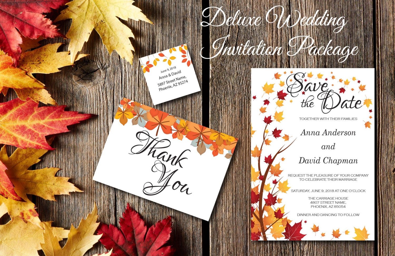 Printable Fall Wedding Invitation Set Templates Watercolor Falling