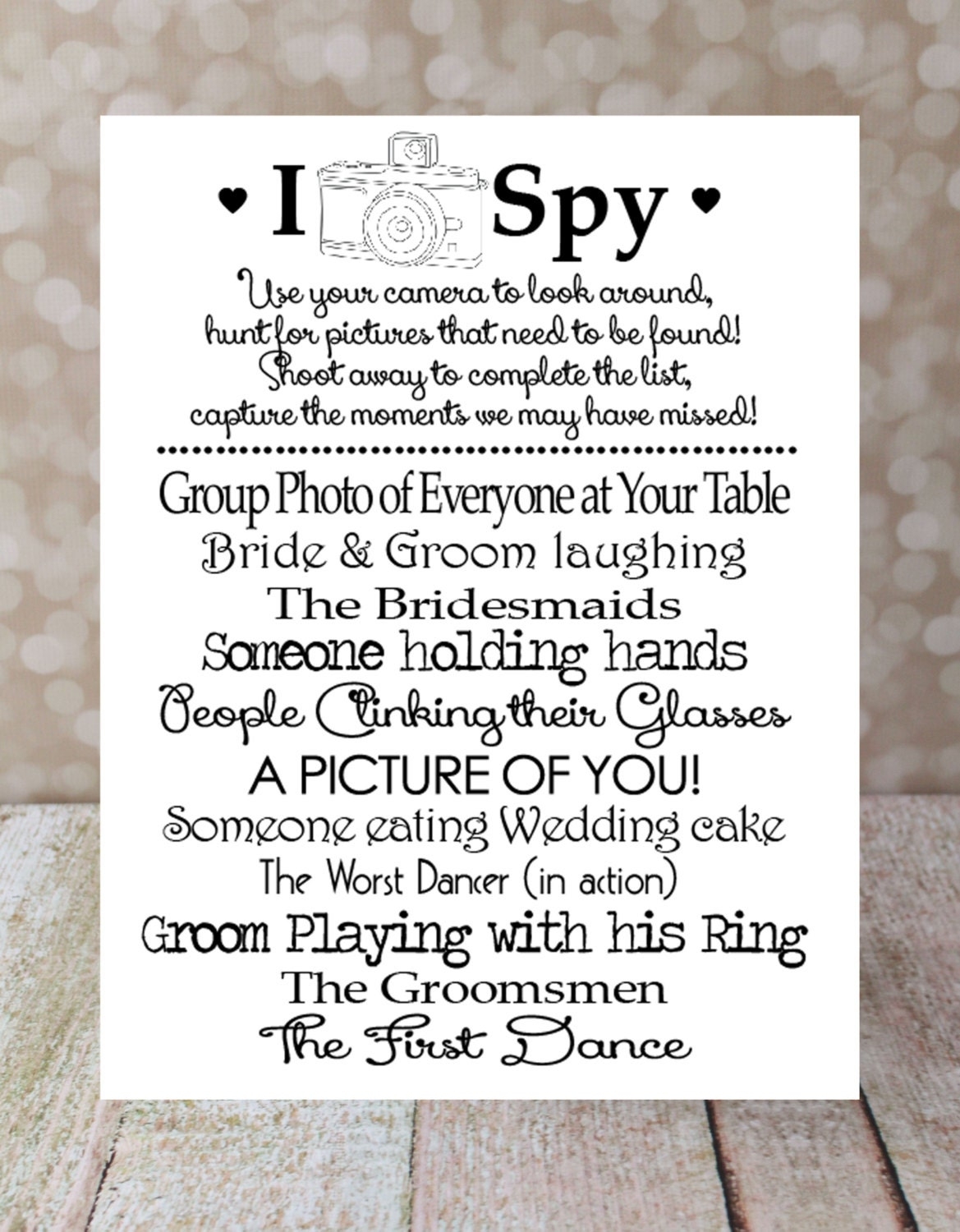 Guests can work individually or in teams to complete the I Spy wedding game challenges, such as capturing a kiss between the bride and groom, snapping a photo of the first dance, or finding a guest wearing a specific color. This game not only keeps guests engaged but also provides you with a unique collection of candid photos from your wedding day.