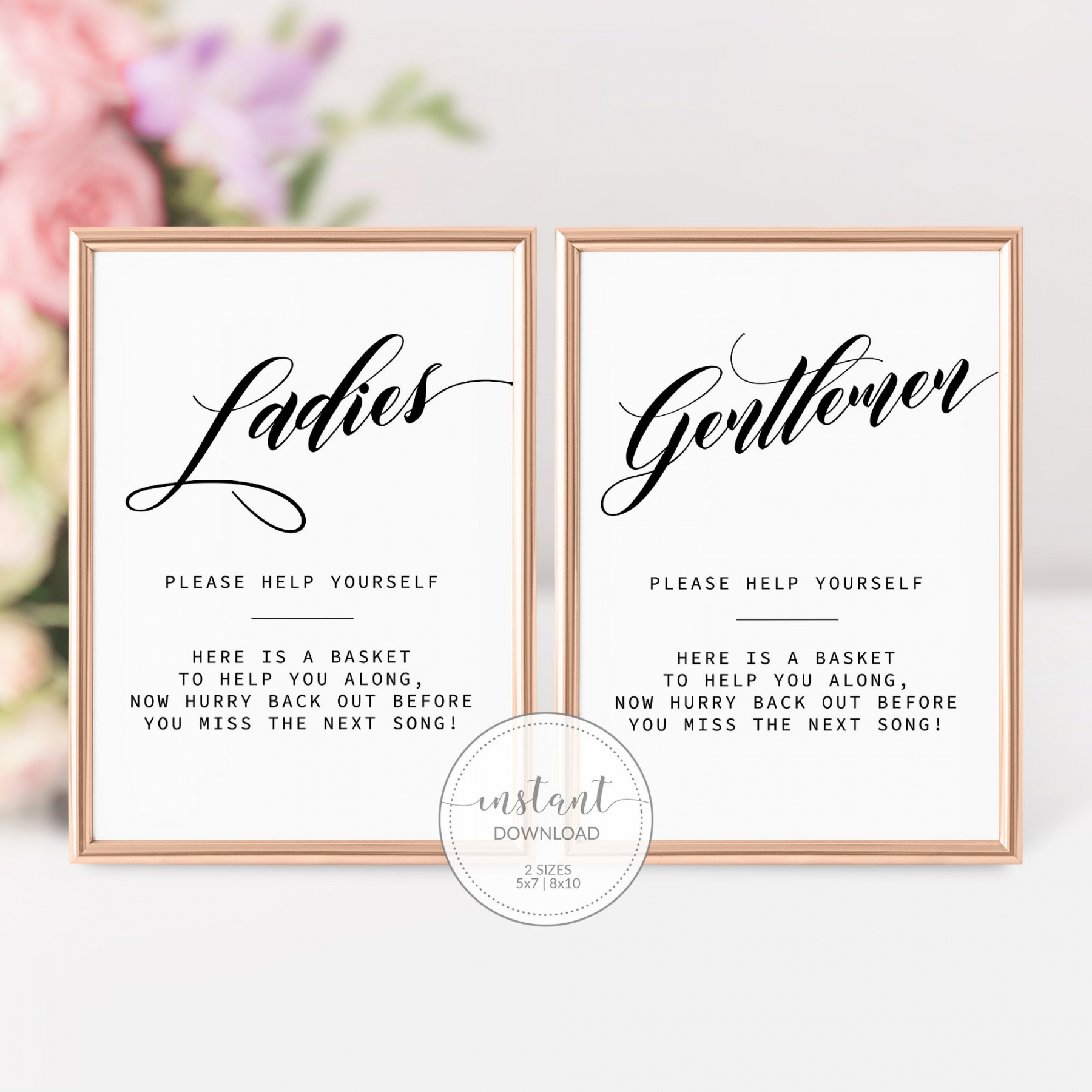 Printable wedding bathroom basket signs are a convenient way to let guests know about the amenities available in the restroom. These signs can be customized to match the theme or colors of the wedding, adding a personalized touch to the overall decor. Placing a sign near the bathroom basket can ensure that guests are aware of the offerings and feel comfortable using them.