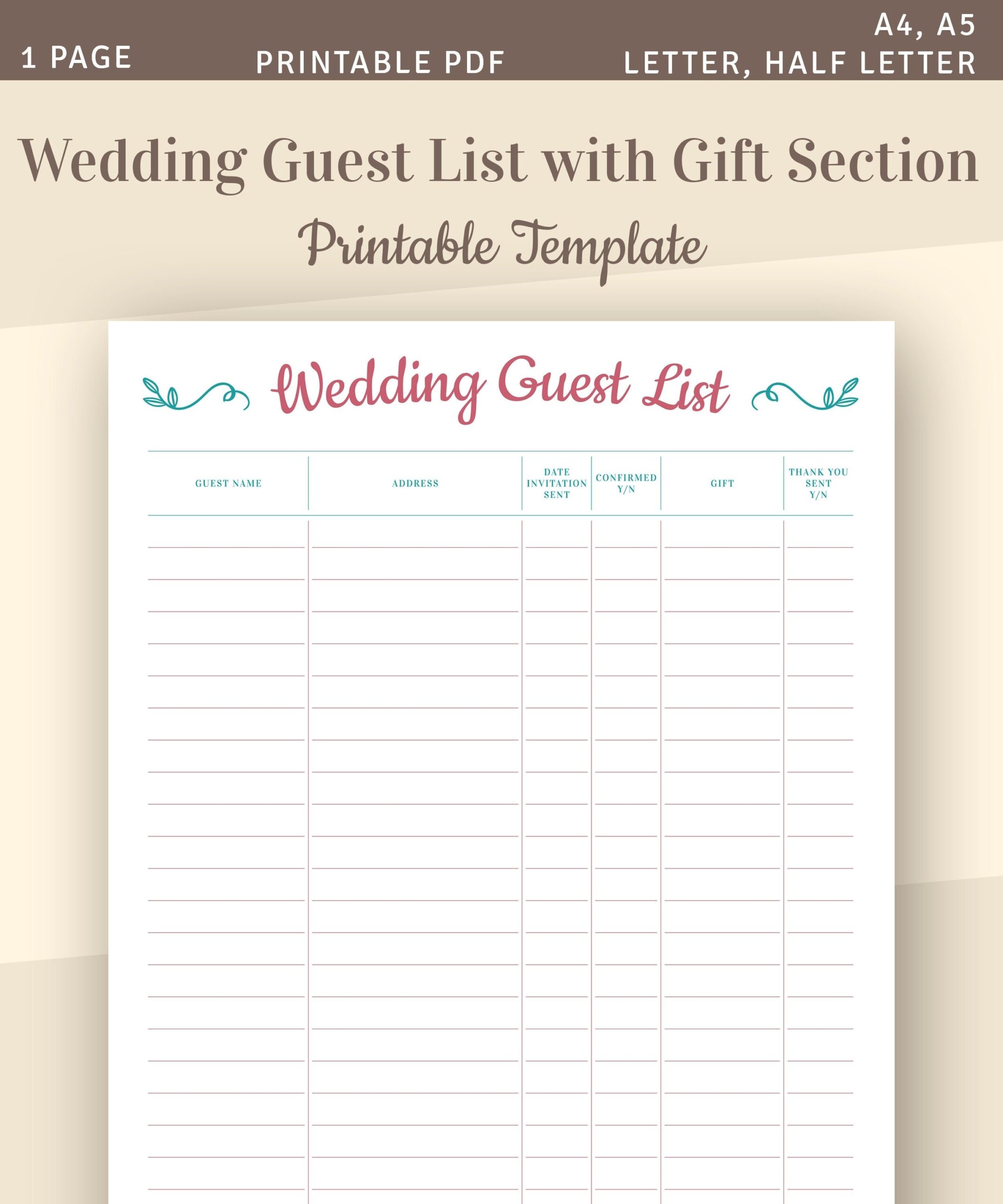 Wedding Guest List Printable Wedding Template Guest List Etsy