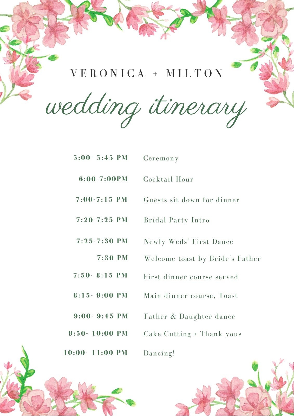 Printable Wedding Itinerary Template