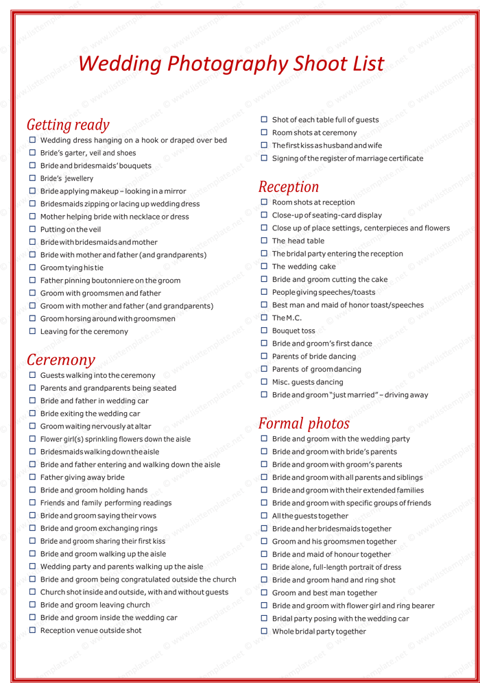 Wedding Photography Checklist Printable Printable Calendars AT A GLANCE