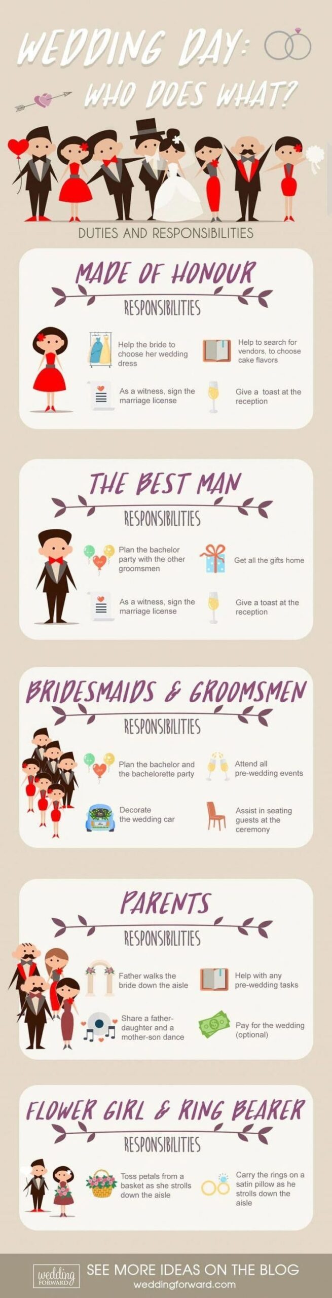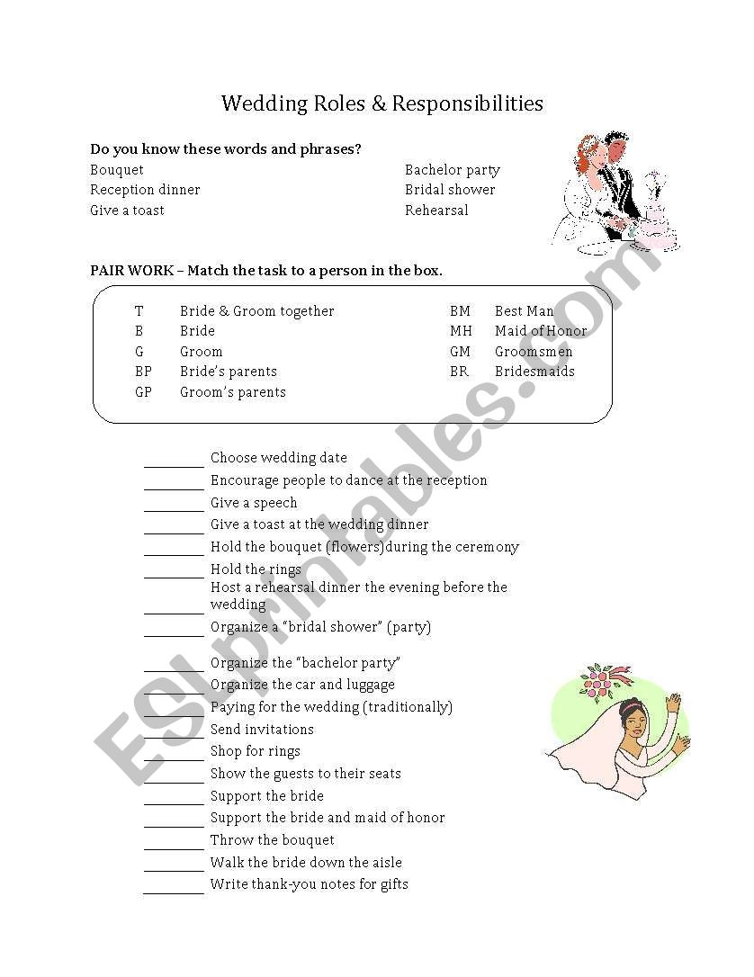 Here is a printable wedding roles list that you can use as a guide when assigning responsibilities for your upcoming wedding: