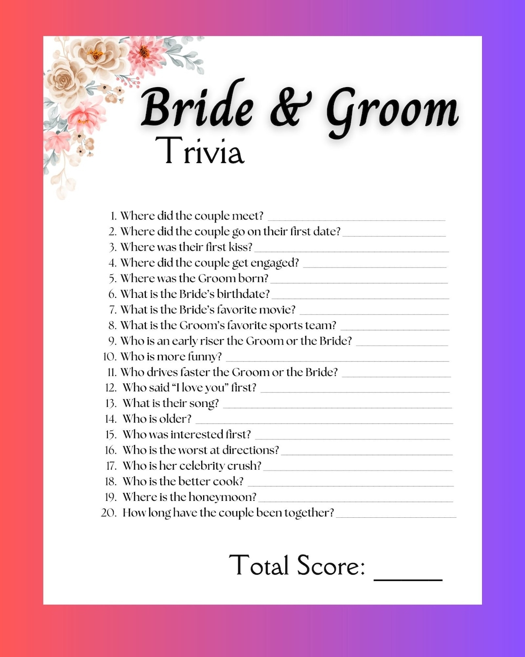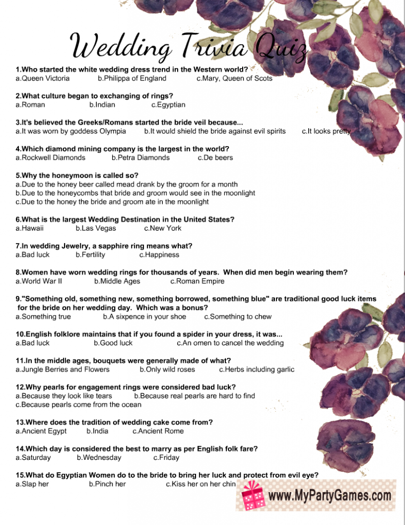 So why not consider adding printable wedding trivia questions to your wedding festivities and make your big day even more memorable!