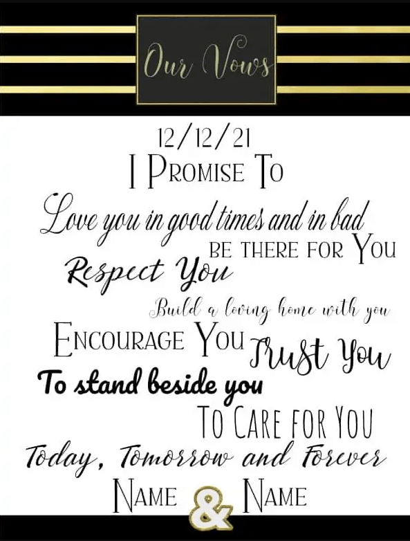 So if you’re struggling to put your feelings into words for your wedding day, consider using a printable wedding vows template to help guide you in creating vows that truly capture the essence of your love and commitment.