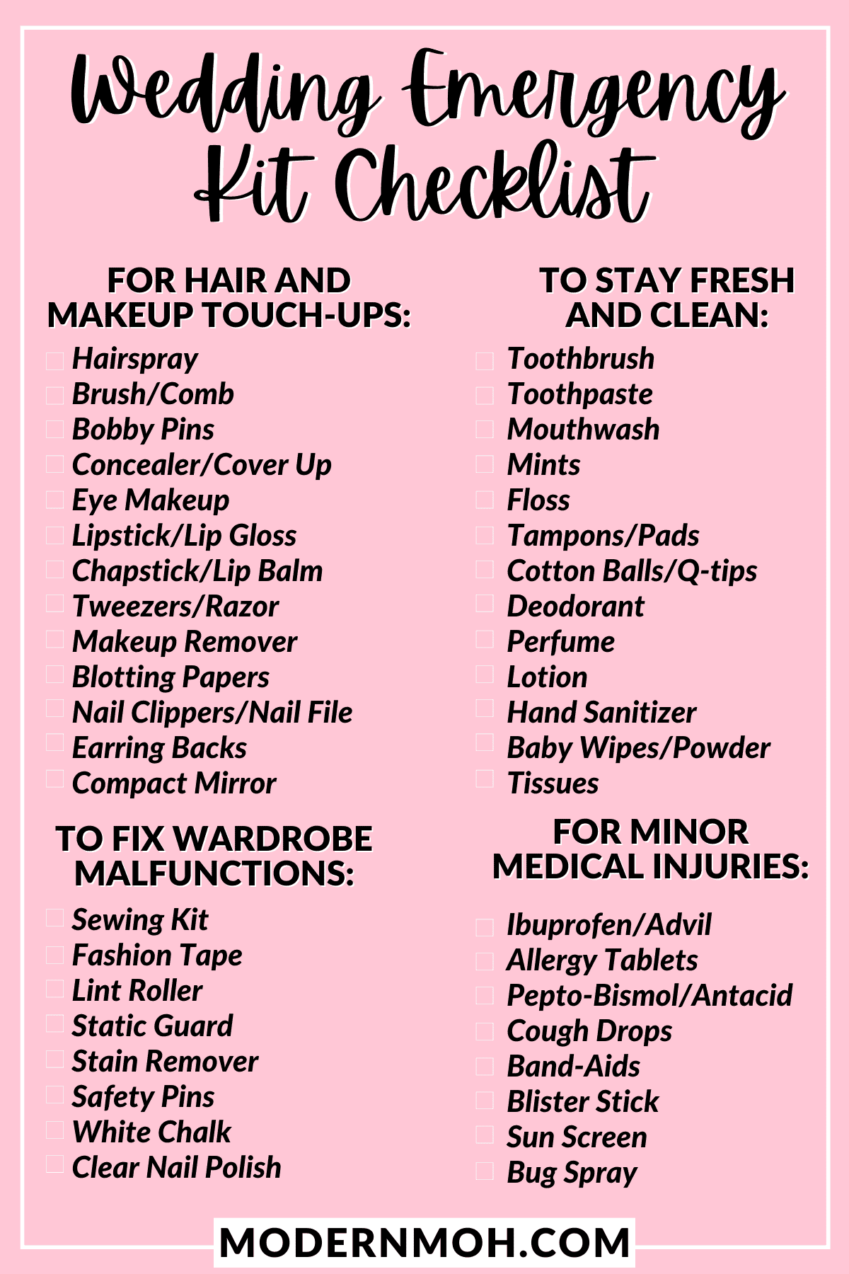 Wedding Day Emergency Kit Checklist Modern MOH