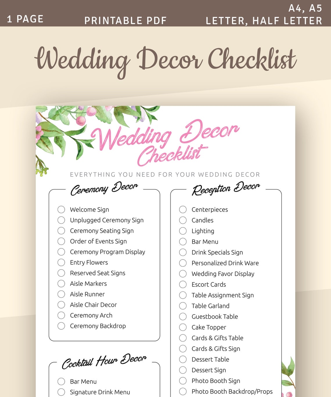 Planning a wedding can be overwhelming, but having a checklist can help keep you organized and on track. One important aspect of wedding planning is the decor, as it sets the tone and ambiance for the entire event. Having a printable checklist can make it easier to keep track of all the details and ensure nothing is forgotten on your special day.