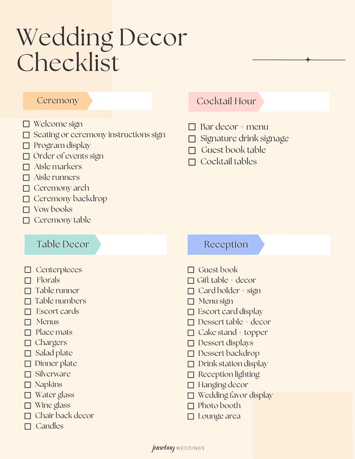 By following this checklist, you can ensure that your wedding decor is cohesive and matches your overall vision for your special day. Remember to delegate tasks to your wedding party or hire a wedding planner to help execute your decor plan.